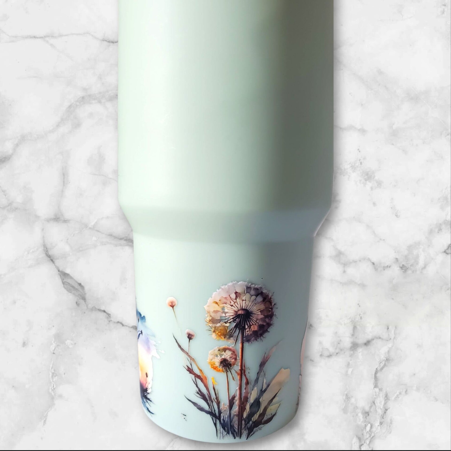 Gourde couleur vert d’eau - 1,2L avec poignée, paille - motif fleurs soufflées