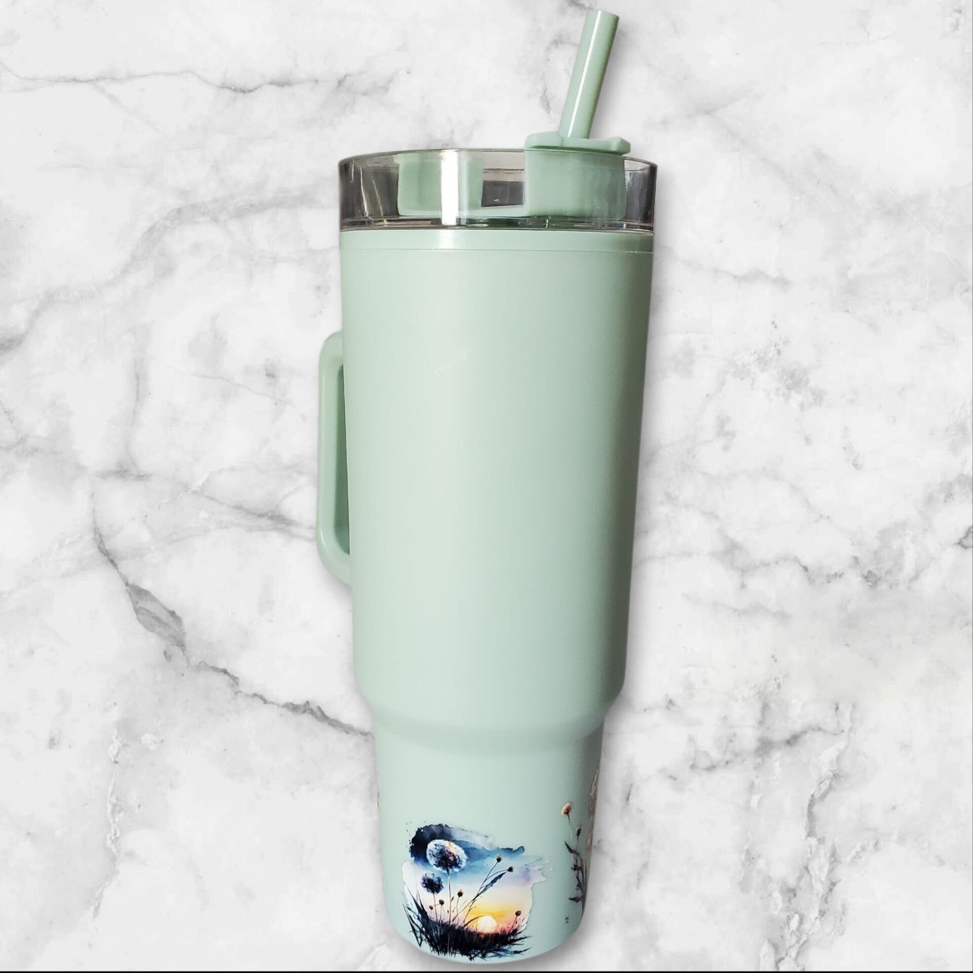 Gourde pratique de 1,2 litre, couleur vert d'eau, avec poignée et paille intégrée pour boire facilement partout. Motif fleurs soufflées délicat et apaisant, parfait pour rendre vos pauses hydratation plus agréables.