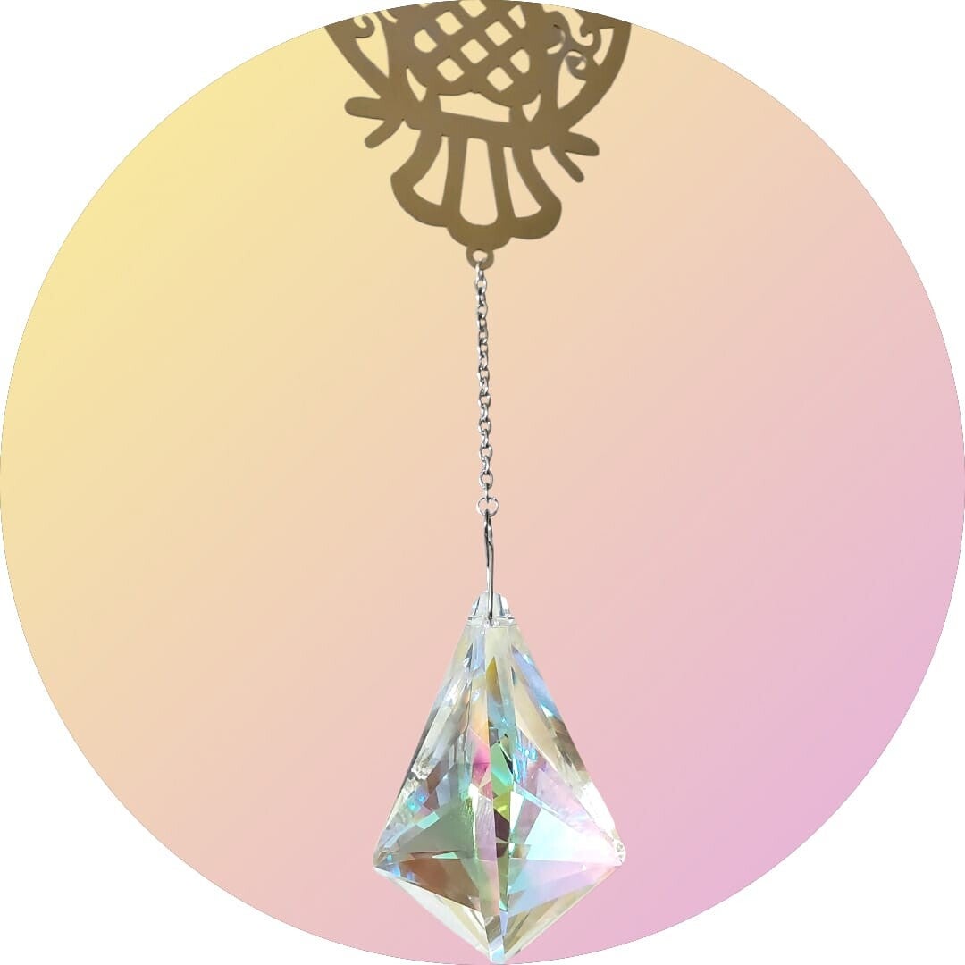 Suspendu à une chaîne argentée, il est sublimé par des pierres en verre au somptueux effet holographique, qui diffusent de magnifiques éclats colorés dans votre espace dès qu’un rayon de soleil les touche.
