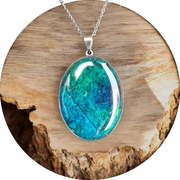 Collier fait main en acier inoxydable, composé d’un plateau 30×40 mm au rendu intense et raffiné. Une création unique, à l’effet pierre précieuse, idéale pour sublimer une tenue.
